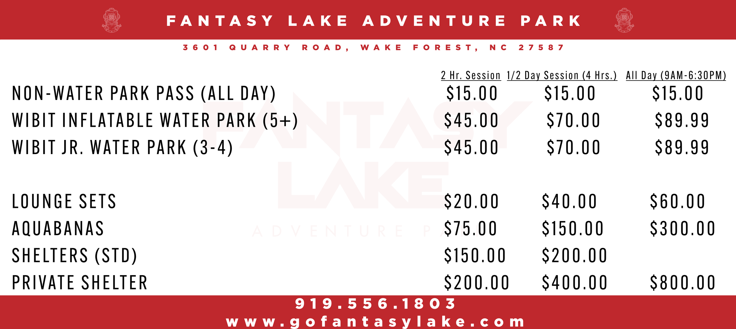 All water activities are available in 4 Sessions - 9am - 11:00am / 11:30 - 1:30pm / 2pm - 4:00pm / 4:30pm - 6:30pm